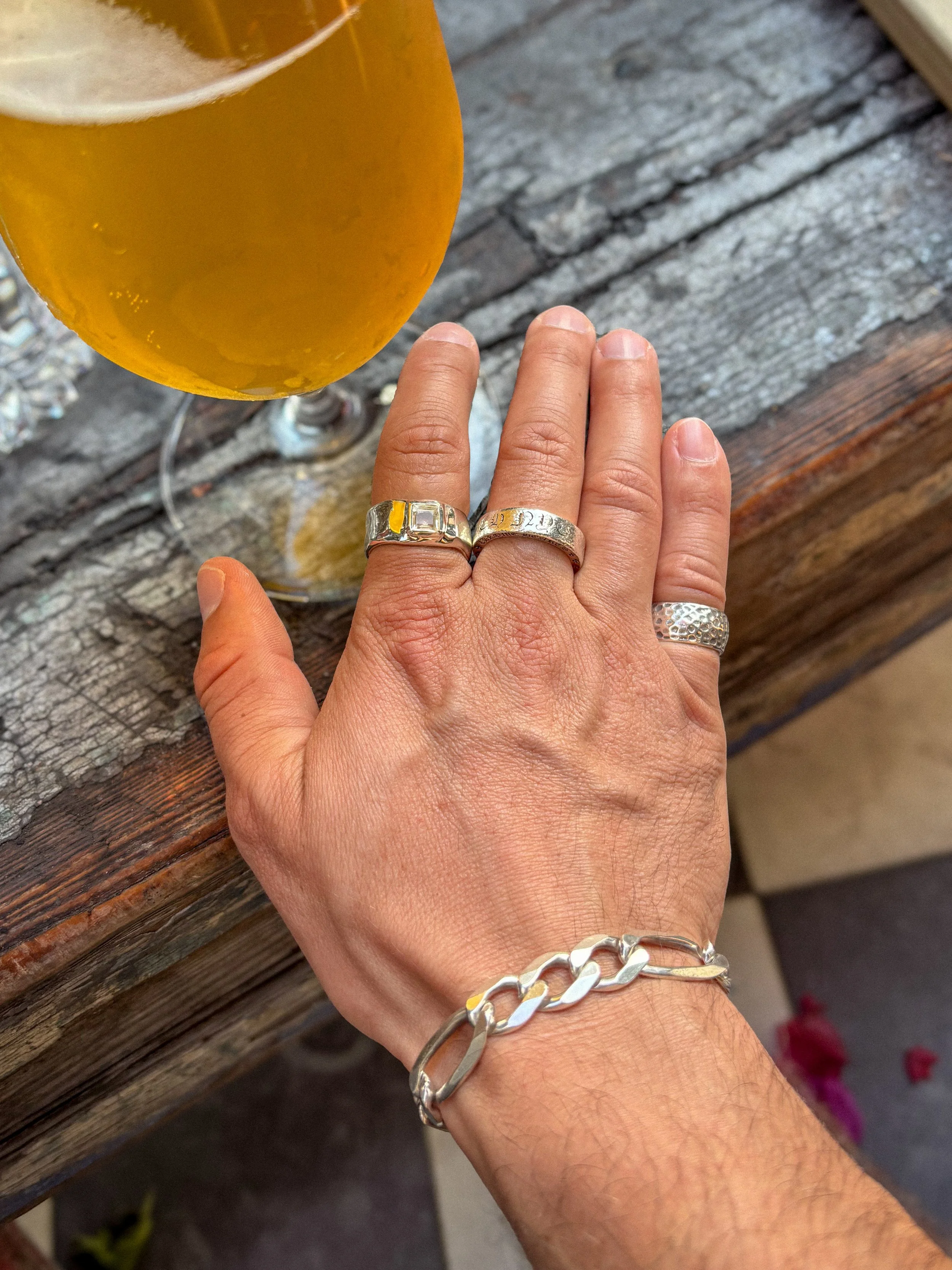 custom jewelry handmade to order in los angeles, california. Categories: All ear neck wrist finger All | ear | neck | wrist | finger | wonky quartz ring $280.00 wonky chain bracelet $420.00 tiny square "c" hoops $120.00 tiny melted penny earrings $120.00 large melted penny earrings $140.00 tiny bubble "c" hoops $120.00 egg ring $180.00 melted hoop earrings $0.00 custom beaded necklace $90.00 thick wonky ring $180.00 thin wonky ring $160.00 stone signet ring $400.00 wonky cuff $280.00 twist ring $200.00 bubble ring $180.00 cigar band ring $160.00 square stone signet ring $200.00 dome ring $180.00 classic band ring $140.00 flat band ring $140.00 ridge ring $200.00